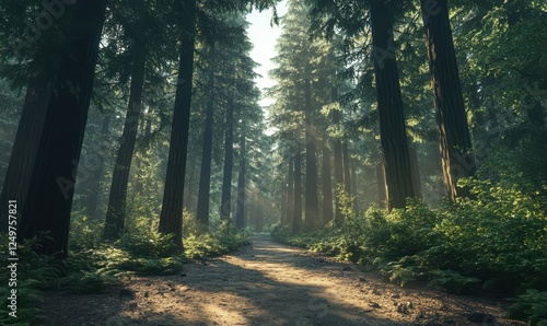 Obraz premium Serene forest trail lined with towering pines and dappled sunlight breaking...