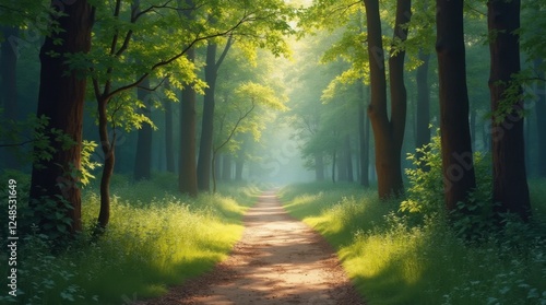 © Cloudy, Obraz premium Serene Forest Trail with Sunlight