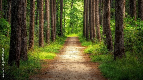 Fototapeta premium Serene Forest Tranquility - Scenic Landscape of Towering Trees and Path...