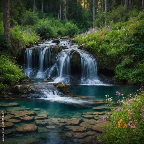 © Anfal, Obraz premium Serene Forest Waterfall – A peaceful waterfall cascading into a crystal-clear pool, surrounded by lush green trees and vibrant wildflowers.
