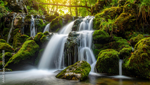 Naklejka premium Serene forest waterfall over mossy rocks at sunrise