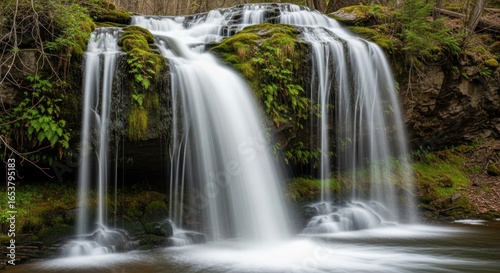 © Suara, Obraz premium Serene Forest Waterfall with Lush Green Moss and Ferns, Soft Silky Water Flow