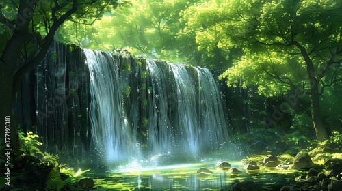 Fototapeta premium Serene forest waterfall with lush greenery and sunlight filtering through...