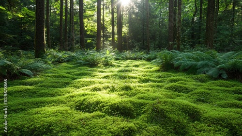 Obraz premium Serene Forest with Lush Green Moss Under Sunlight