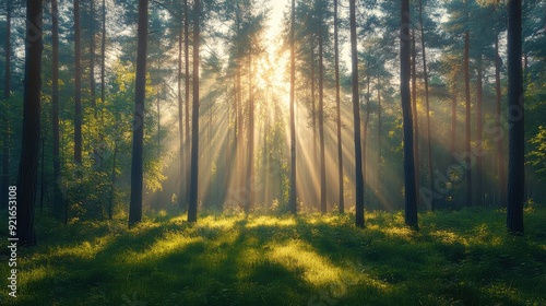© Kamil, Obraz premium Serene Forest with Sun Rays and Mist