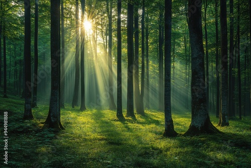 © Kamil, Obraz premium Serene Forest with Sun Rays and Mist
