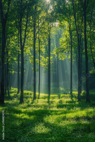 © Kamil, Obraz premium Serene Forest with Sun Rays and Mist