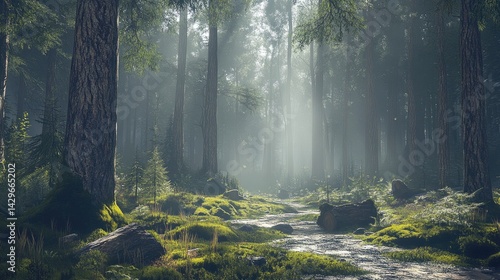 © Sampao, Obraz premium Serene forest with sunbeams filtering through tall pine trees, moss-covered ground, and misty air