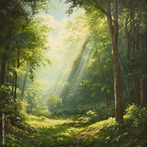 Naklejka premium "Serene Forest with Sunlight Beams"
