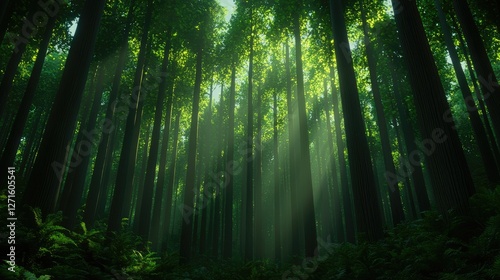 Fototapeta premium Serene Forest with Sunlight Filtering Through Lush Green Canopy