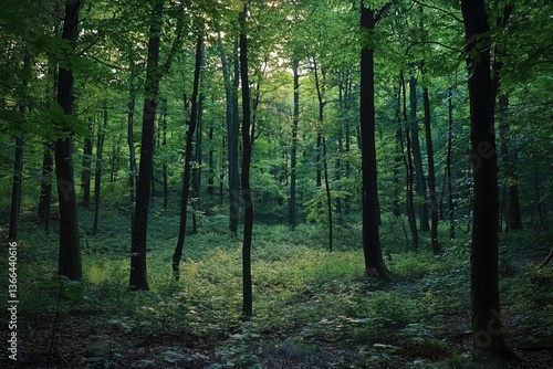 Fototapeta premium Serene forest with sunlight filtering through tall trees and lush green foliage