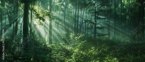 © Man, Obraz premium Serene Forest with Sunlight Rays Through Trees