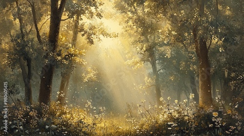 © Hailie, Fototapeta premium Serene Forest with Sunlight Streaming Through Trees