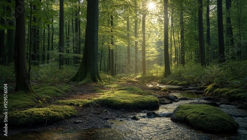 Fototapeta premium Serene forest with tall trees Moss-covered rocks