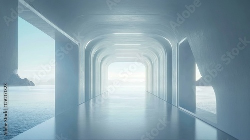 Fototapeta premium Serene Futuristic Corridor Tunnel with Sea View Interior Design Modern Architecture Coastal Dreamscape
