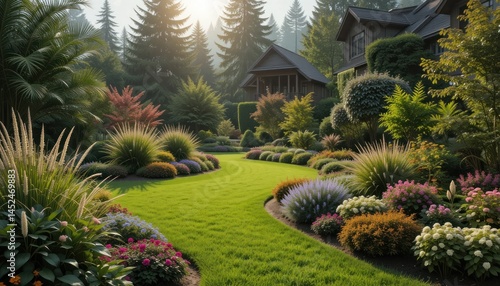 © Muchtar, Obraz premium Serene Garden Landscape Design: Luxurious Homes nestled in Nature's Embrace