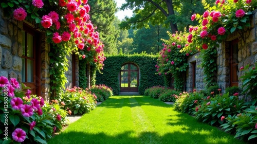 © Wonder Gallery, Fototapeta premium Serene Garden Path Leading to an Archway Between Stone Buildings Flanked by Vibrant Blossoms