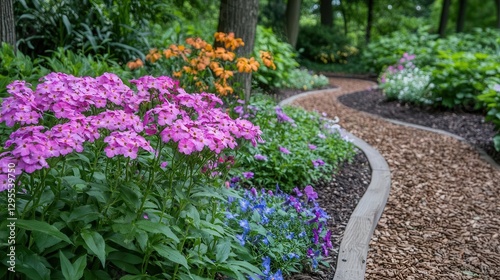 © Esmeralda, Fototapeta premium Serene Garden Path with Blooming Flowers and Lush Greenery