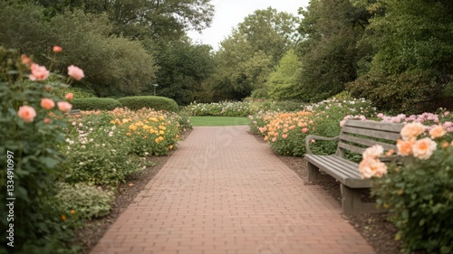 Obraz premium Serene Garden Path with Blooming Roses and Wooden Bench