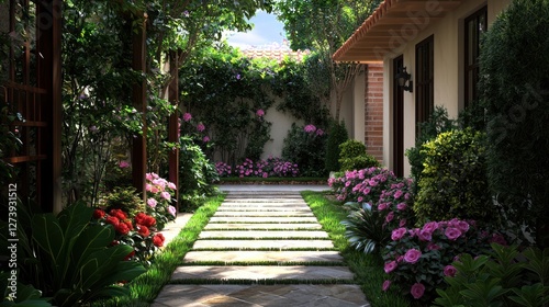Naklejka premium Serene garden pathway adorned with vibrant flowers and lush greenery, leading to a cozy home