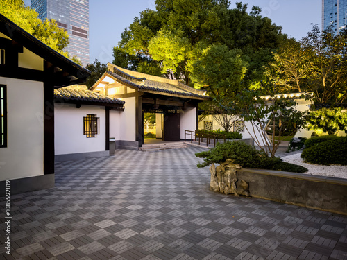 © evening_tao, Fototapeta premium Serene Garden Pathway at Night Surrounded by Nature and Architecture