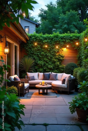 Fototapeta premium Serene garden patio scene featuring lush greenery, comfortable seating, and ambient lighting Perfect for relaxation and outdoor entertaining , plants, home, cozy