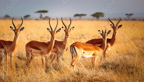 © netsay, Naklejka premium Serene Gaze of Gazelles in Vibrant Yellow Pastures of Serengeti, Tanzania Wildlife at Twilight