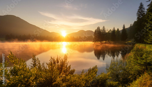 Fototapeta premium serene golden sunrise misty lake surrounded dense forest mountains soft mist warm sunlight creating tranquil atmosphere