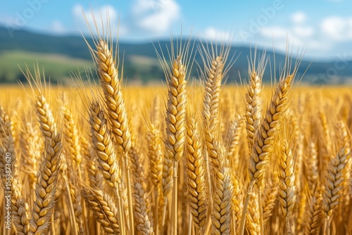 © Dennis, Fototapeta premium Serene Golden Wheat Fields with Snow-Capped Mountain Views