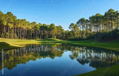 © LyceeChee, Fototapeta premium Serene Golf Course Water Reflection Amidst Tall Trees