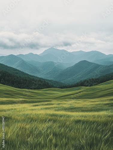 Fototapeta premium Serene Grassland Under Mountain Vista - Tranquil rural landscape, lush green fields gently rolling towards majestic mountains under a soft sky. Peace, nature, serenity, freedom, escape.