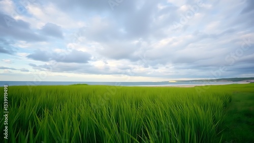 Fototapeta premium "Serene Grassy Field by the French Shore Under a Dramatic Cloudy Sky"
