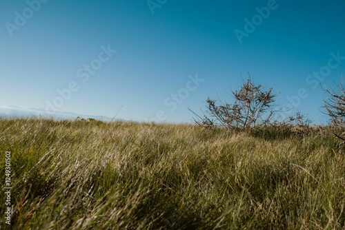 © Wirestock, Obraz premium Serene grassy field under a clear blue sky.