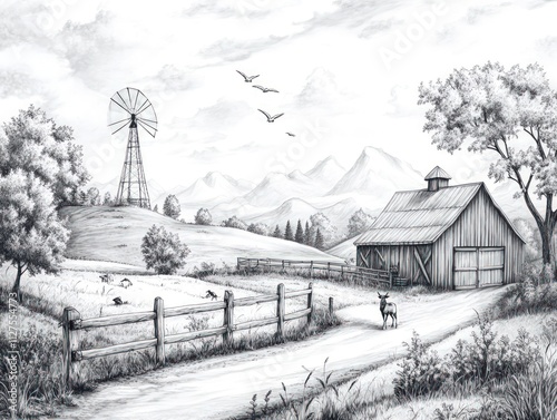 © Ali, Fototapeta premium Serene grayscale farm scene; windmill, barn, animal.