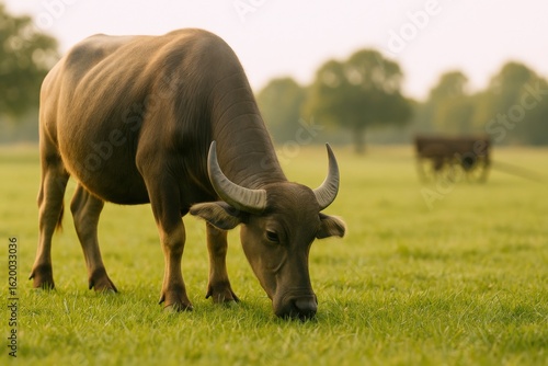 Obraz premium Serene Grazing Buffalo in Lush Green Pasture at Sunrise