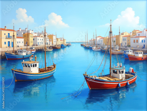© andreiko, Obraz premium Serene Greek Harbor Landscape: Colorful Ships with Blue Hulls Under a Bright Sky