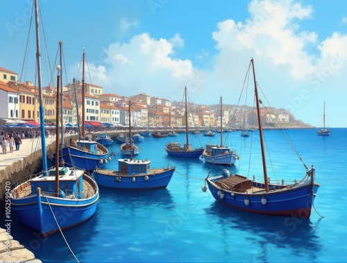 Fototapeta premium Serene Greek Harbor Landscape: Colorful Ships with Blue Hulls Under a Bright Sky