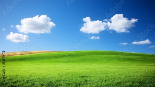 © Adam, Obraz premium Serene Green Field Landscape Under Blue Sky with Clouds