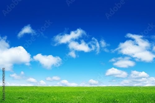 © Shades3d, Fototapeta premium Serene Green Field Under a Blue Sky with Fluffy Clouds - Nature Photography