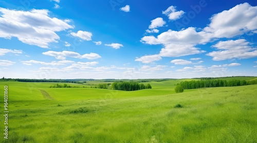 © evening_tao, Fototapeta premium Serene Green Field under Blue Sky