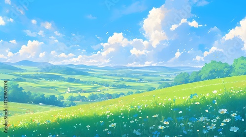 © FiDIO, Obraz premium Serene green fields with wildflowers and soft hills under a blue sky in anime style