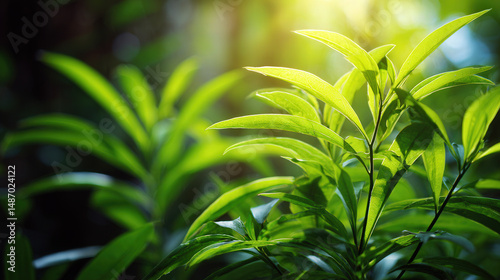 Obraz premium Serene Green Foliage with Sunlight and Bokeh Effects in a Blurred Background