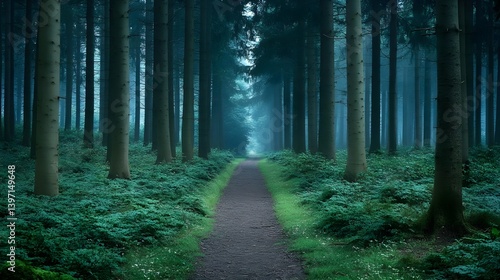 © Neungruedee, Fototapeta premium Serene Green Forest Path Leading into the Tranquil Distance