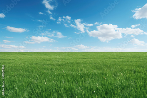 Fototapeta premium Serene Green Grass Field Under Blue Sky With White Clouds