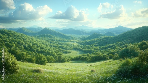 Fototapeta premium Serene Green Hills Landscape: A Breathtaking Panorama of Rolling Hills and...