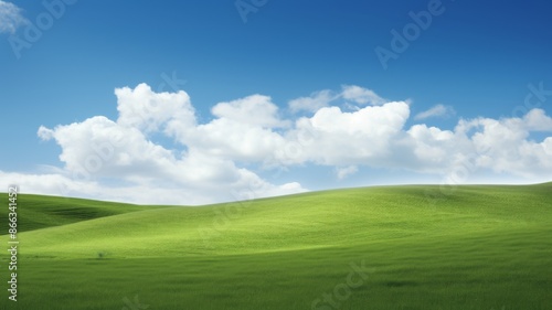 Fototapeta premium Serene green hills rolling under a bright blue sky dotted with fluffy white...