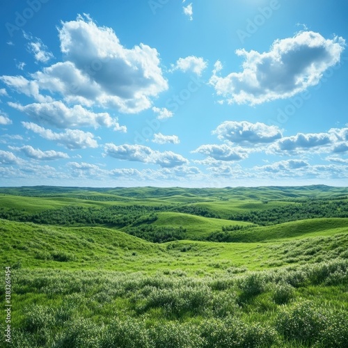 Fototapeta premium Serene green hills under a vast blue sky dotted with fluffy white clouds creating a peaceful landscape vista with trees