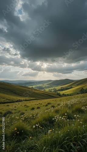 © Kitta Studio, Obraz premium Serene Green Hills Under Dramatic Cloudy Sky with Sun Rays