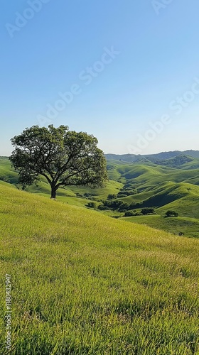 © Tuachan, Fototapeta premium Serene Green Hills with Lone Tree Under Clear Blue Sky