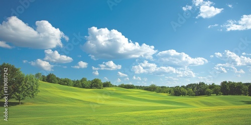 Fototapeta premium Serene Green Landscape under Bright Blue Sky with Fluffy Clouds